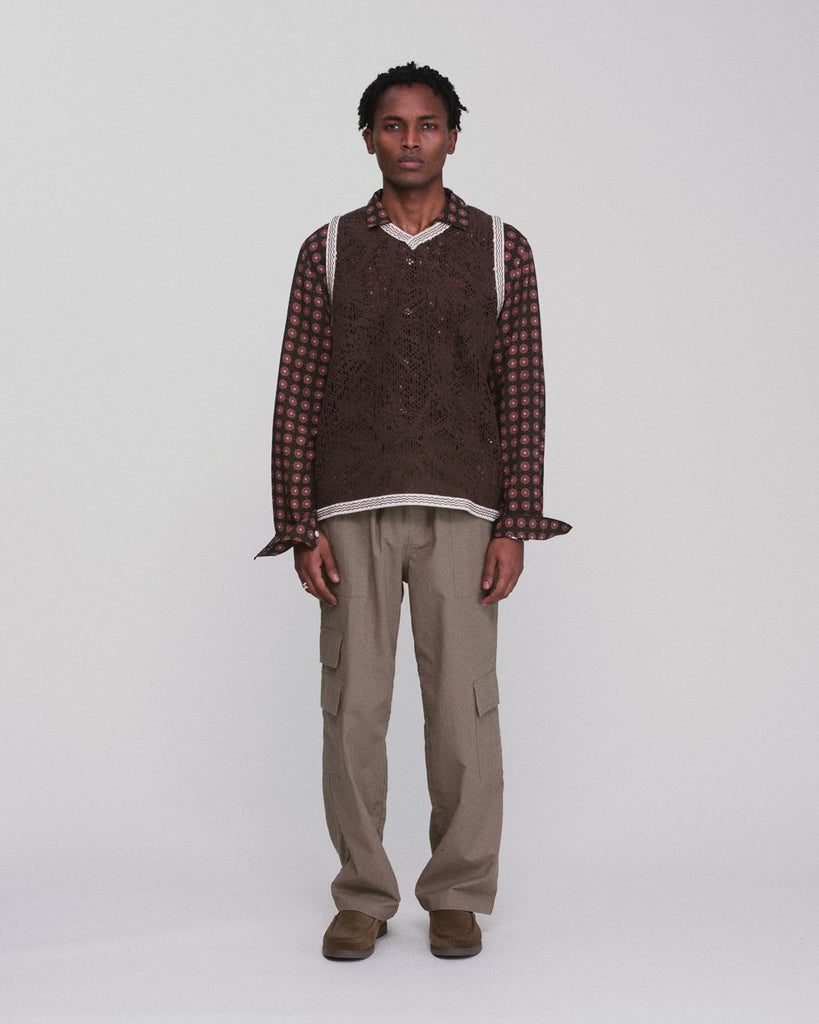 حواف مشغولة حول فتحات الأكمام، وأسفل القميص، وحول الرقبة